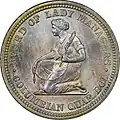 | Motivo | Mujer arrodillada hilando lino, con una rueca en la mano izquierda y un huso en la mano derecha y la leyenda Board of lady managers-Columbian quar.dol. | |||