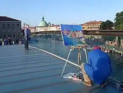 Un artista sobre el puente de la Constitución.