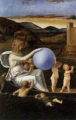 La Fortuna o la Inconstancia, muestra una mujer sentada y sosteniendo una esfera, en una inestable barca rodeada de amorcillos.