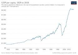Ocupa el puesto 70.º y 73.º en el índice de desarrollo humano elaborado por la Organización de las Naciones Unidas (ONU), y el 6.º entre los latinoamericanos.[25][26] De acuerdo con datos suministrados por el gobierno de Cuba a la ONU, era el único país del mundo a inicios del siglo XXI que cumplía los dos criterios que, para la organización WWF, significan la existencia del desarrollo sostenible: desarrollo humano alto (IDH 0,8) y huella ecológica sostenible (huella < 1,8 ha/p).[27] De acuerdo con dichos datos, además, Cuba y Chile tienen los índices de desarrollo humano más elevados en Latinoamérica;[28][a]si bien, según el Observatorio Cubano de Derechos Humanos, el 88 % de su población vive en situación de pobreza extrema.[34] Según el informe del Programa Mundial de Alimentos de la ONU, además, la dieta promedio en Cuba adolece de una adecuada calidad nutricional debido a diversos factores, como la escasa disponibilidad de alimentos ricos en nutrientes y factores socioeconómicos.[35]