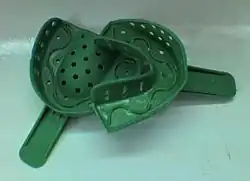 Una cubeta de impresión es un recipiente fabricado especialmente para la realización de tomas de impresiones dentales, por lo que consta de un cuerpo, para contener los diferentes materiales de impresión existentes, que tendrá una forma adecuada adaptada a la anatomía bucal, variando según sea para la arcada superior o inferior. También consta de un mango que le permitirá al odontólogo o higienista dental sujetar dicha cubeta para llevarla a la boca del paciente, por lo que este mango no debe interferir en la funcionalidad de la cubeta de impresión.