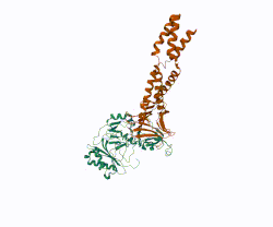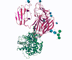 ![]() Estructura del Factor Intrínseco-Cobalamina unido a su receptor Cubilina (CUBN). CUBN está representada en verde y el complejo FI-Cobalamina está representado en azul. | ||||