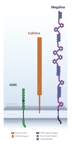 El multi-ligando receptor CUBAM es el responsable por la endocitosis y absorción de la B12. Este está compuesto esencialmente de CUBN, que realiza el reconocimiento y unión al complejo Factor Intrínseco-Vitamina B12 y Amnionless (AMN), una proteína codificada por el gen AMN (14q32), de 38 a 50 kDa, que facilita la endocitosis del complejo. La CUBN, por tanto, requiere de la función de al menos dos moléculas proteicas para su adecuada actuación: el AMN, que participa en el transporte apropiado de esta; y la Lrp2 o Megalina, esencial para la internalización eficiente de la CUBN y sus ligandos.[11]