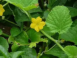 Planta anual monoica de tallos rastreros. Se cultiva por de temporada veraniega con un gran contenido de agua y de sabor dulce. La planta posee tallos blandos y pilosos que crecen a ras del suelo. Sus hojas tienen peciolo acanalado y son palmadas, es decir, su aspecto es semejante al de una mano.
