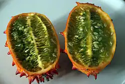 Es cultivada por su fruto comestible de forma de un melón ovalado y con espinas que parecen cuernos. De gusto exótico, entre kiwi y el plátano, cuando se consume con azúcar o en ensalada es parecido al pepino, pero más refrescante. El fruto es amarillo cuando está maduro e incluso se utiliza como decoración en arreglos de mesa.