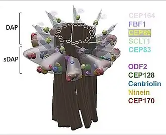 - apéndices distales (DAP en inglés) también llamadas láminas alares, fibras de transición. Los nueve apéndices distales se proyectan hacia afuera desde el extremo distal del cuerpo basal, son necesarios para el acoplamiento de membrana y la cilogénesis.