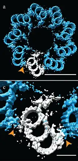 - ↑ Greenan G.A., Keszthelyi B., Vale R.D., Agard D.A. (2018). «Insights into centriole geometry revealed by cryotomography of doublet and triplet centrioles». eLife 7. Consultado el 7 de mayo de 2020.