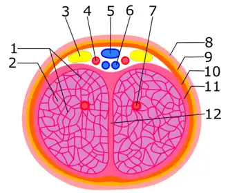 ![]() Anatomía interna del cuerpo del clítoris: 1. Trabéculas de los cuerpos cavernosos del clítoris; 2. Espacios cavernosos; 3. Nervio dorsal del clítoris; 4. Arteria dorsal del clítoris; 5. Venas dorsales superficiales del clítoris; 6. Vena dorsal profunda del clítoris; 7. Arteria profunda del clítoris; 8. Piel; 9. Capa membranosa del tejido subcutáneo; 10. Fascia del clítoris; 11. Túnica albugínea; 12. Septo del clítoris. | ||