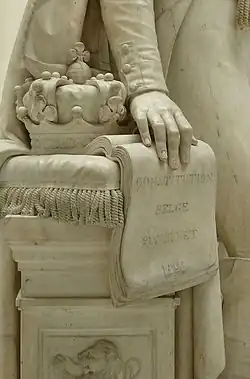 - ↑ Enmiendas posteriores han hecho que la cláusula sobre la incapacidad de gobernar del monarca hayan pasado del artículo 82 al 93.[29] La readacción en sí no ha cambiado y volvió a utilizarse durante un día de 1990 para permitir la aprobación la legalización del aborto sin que tuviese que firmar la ley el entonces rey Balduino.[30]