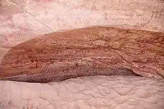El resto de pinturas muestran grupos de seres humanos bailando o incluso flotando o nadando,[4] como en la Cueva de los nadadores, aunque no siempre parecen estar relacionados con las bestias: En la parte inferior de la izquierda, aprovechando una grieta natural, aparecen por encima de la misma un grupo de personas manteniendo una honda en las manos levantadas. Por debajo de la grieta hay otro grupo de tamaño más pequeño con una mano levantada mirando hacia un lado. Esparcidas por las paredes del abrigo hay representaciones de fauna silvestre: un elefante, avestruces, antílopes y jirafas.