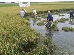 Después del trasplante, se necesita una vigilancia periódica del arrozal hasta que llega el momento de la siega. Los cuidados se refieren principalmente al nivel del agua, la eliminación de las malas hierbas y el abonado.[5]
