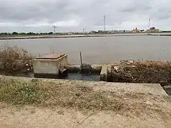 En el caso de los arrozales situados en tierras planas, como en el caso de la Albufera, donde el nivel de los campos y la laguna es el mismo, se utilizan bombas para extraer el agua de los campos hacia las acequias. Para inundar los campos basta con abrir la compuerta.[3]