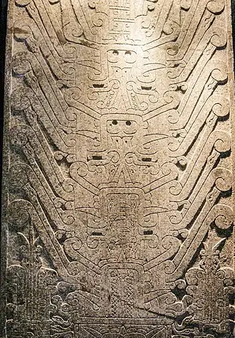 El obelisco Tello es una escultura monolítica en granito en forma de prisma rectangular perteneciente al sitio arqueológico de Chavín de Huántar del Formativo Tardío, periodo ubicado entre los años 900 a. C. y 200 a. C.[15] Fue descubierto por Trinidad Alfaro en 1908 en el sitio arqueológico de Chavín en el distrito homónimo de la provincia de Huari en Áncash, Perú.[16] En 1919 el arqueólogo Julio C. Tello fue el primero en estudiarlo científicamente, resaltando su importancia, por lo que fue bautizado con su nombre. Su superficie está cubierta de diseños labrados complejos y estilizados que muestran a dos figuras principales gemelas de sexo opuesto y representaciones asociadas al signo de la chakana, a animales, y a elementos de plantas como flores, tallos, frutos y semillas.[17][18] La función que cumplía es motivo de controversia entre quienes lo estudian desde su descubrimiento y hasta el presente.[15]