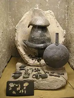 Ajuar funerario de la tumba masculina 871 de la necrópolis de Casal del Fosso, circa 730-720 a. C. Escudo circular de bronce decorado con hileras de puntos en relieve. -