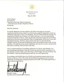 - ↑ Stokols, Eli (24 de mayo de 2018). «Trump pulls out of planned nuclear summit, says he will be 'waiting' if North Korea changes its approach». Washington: Tronc. Consultado el 25 de mayo de 2018. «In a dramatic diplomatic setback, President Trump abruptly reversed course Thursday and pulled out of his scheduled nuclear summit with North Korean leader Kim Jong Un, releasing a letter to Kim that blamed the 'tremendous anger and open hostility displayed' by Pyongyang.»