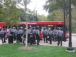 - ↑ a b Moriah Balingit; Vivian Nereim (26 de septiembre de 2009). «110 arrested in clash with police in Oakland». Post-Gazette (en inglés). Archivado desde el original el 29 de septiembre de 2009.