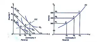 La figura adjunta muestra el proceso de derivación de la curva de Engel en el caso de las necesidades. El panel (a) es un gráfico indiferenciado que representa las preferencias de los consumidores por los bienes X e Y. Las tres líneas paralelas de 300 rupias, 400 rupias. Y 500 rupias se denominan líneas presupuestarias. Y la pendiente de estas tres líneas es la misma, lo que implica que los precios de los dos bienes son constantes, mientras que la línea presupuestaria más alejada del origen indica una cantidad presupuestaria mayor. Los tres puntos R, S y T del gráfico indican distintas combinaciones de preferencias. La línea que une estos tres puntos se denomina curva renta-consumo (CCI). Ampliando el panel (a) al panel (b), se obtiene la curva de Engel del bien X uniendo los puntos R', S' y T'.[3]