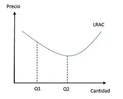 - Si el proceso de producción está presentado incrementos o decrementos, el costo promedio mínimo a corto plazo no es igual al costo promedio a largo plazo. Si existen rendimientos crecientes de escala, el mínimo valor en el largo plazo producirá en un nivel inferior de insumos que el SRAC. Esto es porque hay economías de escala que aún no se han explotado, entonces en el largo plazo una empresa siempre va a producir una cantidad al precio bajo en el coste promedio mínimo a corto plazo, utilizando una planta más grande.[14]