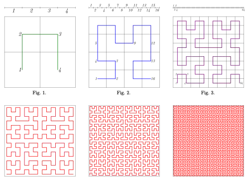 Un año después, David Hilbert publicó en la misma revista una variación de la construcción de Peano (Hilbert, 1891). El artículo de Hilbert fue el primero en incluir una imagen que ayuda a visualizar la técnica de construcción, esencialmente la misma que se ilustra aquí. Sin embargo, la forma analítica de la curva de Hilbert es más complicada que la de Peano.