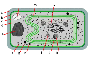 a.- Membrana externa; b.- Capa de peptidoglucano; c.- Membrana plasmática; d.- Citosol; e.- Gránulo de cianoficina; f.- Ribosoma; g.- Gránulo de glucógeno; h.- Cuerpo lipídico; i.- Carboxisoma; j.- Ficobilisoma. k.- Gránulo polifosfato; l.- Vacuola gasífera; m.- Tilacoide; n.- ADN.