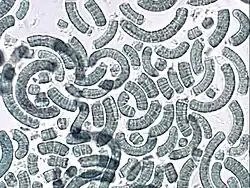 ![]() Cianobacteria filamentosa del género Lyngbya sp., recolectada en Baja California, México. | ||