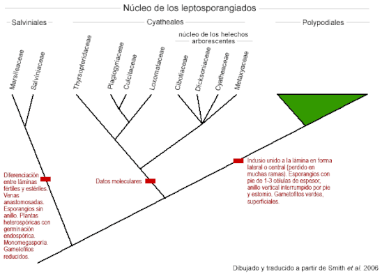 ![]() Árbol filogenético actualizado y taxonomía de Salviniales y Cyatheales en el "Núcleo de los leptosporangiados". Dibujado a partir de Smith et al. (2006). . |