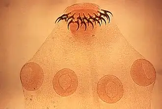 ![]() Escólex de Taenia solium en se observan las ventosas y los ganchos de fijación | ||