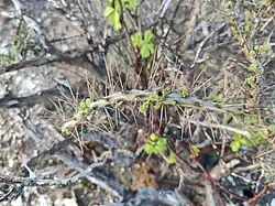 Los brotes son articulados, tienen tubérculos alargados y están formados por segmentos que se desprenden con facilidad. Cada uno de ellos mide de 1,5 a 9 cm de largo y de 0,4 a 0,8 cm de diámetro. Tienen forma cilíndrica, son muy delgados y tienen la epidermis de color verde a verde grisáceo, llegado a adquirir tonos púrpura alrededor de las areolas.[3]