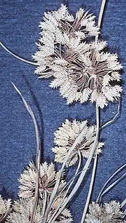 Se trata de una planta anual con un tallo de fino que alcanza un tamaño de 40 centímetros de altura como máximo. Puede tener algunas hojas delgadas cerca de la base. Su esférica inflorescencia mide de uno a dos centímetros de ancho y contiene varias espiguillas cada una de unos pocos milímetros de largo. Cada espiguilla tiene una capa plana de flores que producen aquenios de forma ovalada, cada uno de alrededor de un milímetro de largo.