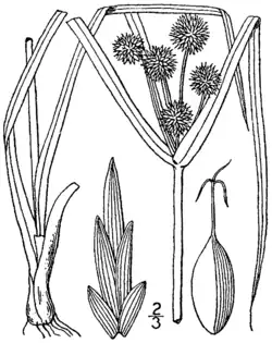 Es una planta perenne con rizomas cortos, nudosa, que carece de tubérculos. Alcanza un tamaño de 30-100 cm de largo, fuertemente trígono, los lados a veces un tanto cóncavos y suaves. Hojas de 15-65 cm de largo x 3-9 mm de ancho, más cortas que los tallos. Inflorescencias en umbelas irregulares con 1-2 espigas sésiles y 3-12 rayos, cada rayo liso, que termina en una punta. Brácteas 4-7, en su mayoría un tanto ascendente. Espigas de 8-18 mm de largo, con 60 a más de 100 espiguillas, globosas o casi, muy densas, las espiguillas irradian en todas las direcciones del eje. Frutas 1.8 a 2.3 mm de largo, estrechamente oblongas en contorno, bruscamente en ángulo recto en sección transversal, los lados planos, la superficie de color marrón, brillante.[2]