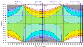 En latitudes medias, lejos del ecuador y de los polos, las variaciones en la duración del día son leves. En las latitudes medias altas donde se encuentra Montreal, París y Ushuaia, la diferencia en la duración del día de verano a invierno puede ser muy notable: el cielo puede estar todavía iluminado a las 22 horas en verano, pero puede estar oscuro a las 17 horas en invierno. En las latitudes medias bajas donde se encuentran el sur de California, Egipto y Sudáfrica, la diferencia estacional es menor, pero aun así resulta en aproximadamente 4 horas de diferencia en la luz del día entre los solsticios de invierno y verano. La diferencia se hace menos notable a medida que uno se acerca al ecuador. Se puede obtener una aproximación al cambio mensual a partir de la regla de los 12 años. Con un cambio de 4 horas en los seis meses de invierno a verano, el día se alarga en aproximadamente 4*1/12 de una hora (20 minutos) en el primer mes, 4*2/12 (40 minutos) en el segundo mes, 4*3/12 (1 hora) en el tercer mes, luego 1 hora, 40 minutos y 20 minutos en el cuarto, quinto y sexto mes.