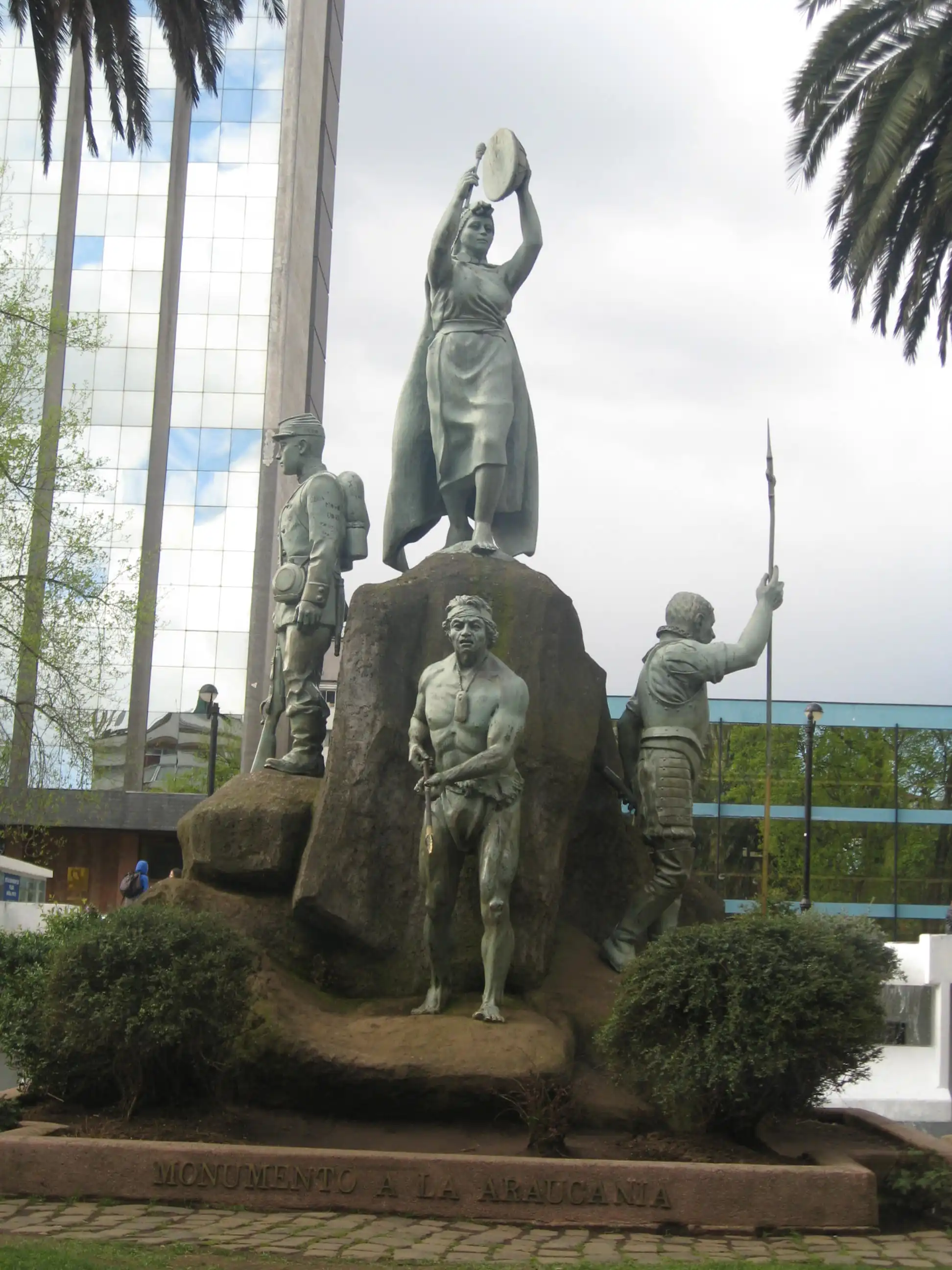 Estatuas de un soldado chileno, araucano y español en la plaza de armas de Temuco. | ||