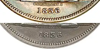 En septiembre de 1836, el jefe de moneda, Adam Eckfeldt, comenzó el grabado de los troqueles que se utilizarían para acuñar las monedas.[12] Sin embargo, antes de que comenzara la producción, Patterson ordenó que el nombre de Gobrecht se agregara al dólar, de esta forma se incluyó el texto «c. gobrecht f» (abreviatura de Christian Gobrecht Fecit, que significa «Christian Gobrecht lo hizo»). El dólar de Gobrecht fue acuñado por primera vez en diciembre de 1836,[13] e inicialmente se produjeron y distribuyeron varias unidades por toda Filadelfia. A pesar de la recepción positiva del diseño general, muchos criticaron la destacada exhibición del nombre de Gobrecht en la moneda,[12] e incluso el mismo Gobrecht solicitó que este texto se eliminara por completo de la cara de la moneda, sin embargo, el grabador recibió instrucciones de cambiar su tamaño y ubicación, a instancias de Patterson.[14]