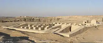 Dahan-e Gholaman es el mayor yacimiento aqueménida de todo el este de Irán.[2] Unas 27 estructuras alineadas aproximadamente en una línea recta que va del suroeste al noreste a lo largo del borde norte del yacimiento fueron excavadas por el arqueólogo italiano U. Scerrato en 1962-1965 y por el arqueólogo iraní S. M. S. Sajjadi en 2000-2005. Otras exploraciones geofísicas y de superficie realizadas entre 2007 y 2011 revelaron el contorno de otro edificio monumental situado a 2 km al sur del complejo de edificios del norte.[3] Varias de las estructuras más grandes excavadas o detectadas en Dahan-e Gholaman tienen plantas rectangulares o cuadradas regulares y soportan la comparación con los edificios palaciegos y los salones de audiencias de las residencias reales aqueménidas de Pasargada y Persépolis, así como de Dasht-e Gohar.[4] Una de las estructuras ha sido identificada como un edificio religioso, sus tres altares posiblemente dedicados a los principales dioses persas Ahura Mazda, Anahita y Mitra.[5]