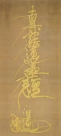 El Kanjin honzon shō también introdujo el concepto del "gran maṇḍala" (daimandara), una representación caligráfica de la asamblea descrita en el Sutra del Loto, inspirada en la iconografía esotérica. Nichiren creó más de 120 ejemplos de este maṇḍala, en el cual el daimoku está inscrito de forma prominente en el centro, flanqueado por los nombres del Buda Shakyamuni y el Buda Muchas Joyas (Tahō Nyorai), reflejando la escena descrita en el Sutra del Loto donde estos Budas se sientan juntos en la estupa enjoyada. Nichiren enseñó que a través de la fe en el Sutra del Loto y la recitación del daimoku, el devoto "entra" en este maṇḍala, participando así en la realidad iluminada del Buda primordial.[20]