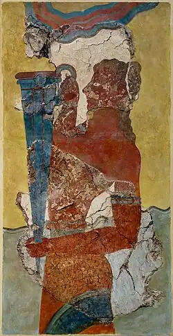 - ↑ Nicola Jane Debbo (2000), The role of the women in the frescoes from Akrotiti. An examination of the iconography of dress, hairstyle and jewellery, pp.65,72,113. tesis doctoral, Universidad de Queen. (en inglés)