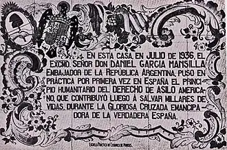 El 7 de julio de 1940, se tributó en Zarauz un elocuente homenaje a Don Daniel García-Mansilla, ex Embajador de la República Argentina en España, al colocar en la Casa Azul de Ayalauna hermosa lápida conmemorativa, aunque con un texto marcadamente franquista. Más allá del tinte ideológico final, se destaca la meritoria actuación del referido diplomático, al conceder asilo por primera vez en España a varios españoles durante los trágicos días de la guerra civil.