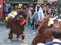 Japón tiene una larga tradición de la danza del león y la danza se conoce como shishi-mai 獅子舞) en japonés. Se cree que se importó de China durante la dinastía Tang y se asoció con la celebración del cumpleaños de Buda. La primera danza de león grabada en Japón fue en las ceremonias de inauguración de Tōdai-ji en Nara en 752.[45] La máscara de león más antigua sobreviviente, hecha de madera de paulownia con una mandíbula inferior articulada, también se conserva en Tōdai-ji.[46] La danza se realiza comúnmente durante el Año Nuevo para traer buena suerte y ahuyentar a los espíritus malignos, y los bailarines de leones pueden estar acompañados por músicos de flauta y tambores. También se realiza en otros festivales y celebraciones. En algunas de estas actuaciones, los leones pueden morder a la gente en la cabeza para traer buena suerte.[47]