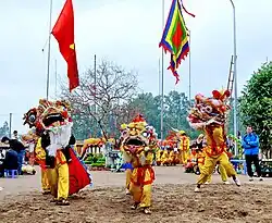 La danza del león es conocida en Vietnam como la danza del unicornio (vietnamita : múa lân) basado en la criatura mítica kỳ lân, que es similar al Qilin chino. La mayoría de los leones de Vietnam se parecen al León del sur, son parte de la tradición china del León del sur, pero han adquirido características locales. Sin embargo, también hay distintas formas locales que difieren significativamente en apariencia y rendimiento, por ejemplo, las danzas de los leones de las minorías Tay y Nung.[42] Una versión de corte de la danza se realiza en el Teatro Duyet Thi Duong en el suelo del palacio real en Huế.[43] La danza kỳ lân generalmente involucra parejas; amarillo para un hombre y verde para una mujer. El baile generalmente se basa en el proceso de apareamiento, nacimiento y ciclo de vida de kỳ lâns.