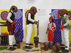 Niño David, el cual está ataviado con camisa azul, pantaloncillo rojo, adornado con cinta blanca, chaleco con plumas, zapatos negros cascabeles en ambos lados del tobillo, y en la mano una lanza de madera.[14]