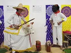 El caballito y Jinete: confeccionado con una armazón de madera y tela blanca. Lleva bordados en la montura con motivos florales. Hacia ambos costados del caballo sobre la montura se observan lo que simulan ser las piernas del danzante, confeccionadas con tela y zapatos de niño. Cabe señalar que la armazón es hueca y para colocarse se auxilia de dos cuerdas de ixtle que van colocadas a los costados del caballito, pasándolas de forma cruzada sobre su pecho y la espalda. El ejecutante porta en su mano derecha un machete y con la mano izquierda simula llevar el cordel del caballo.[4]