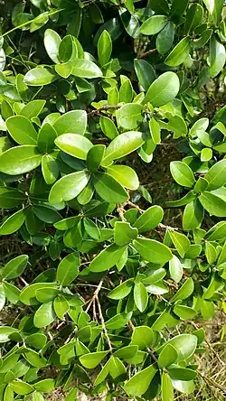 Hojas simples, alternas,sésiles o subsésiles sin o con un pecíolo muy corto), espatuladas, oblanceoladas hasta obovadas, borde liso, sin pelos, de ápice retuso y base cordada.[1]Flores en racimos nacen en las partes desnudas de ramas y ramillas, blancas verdosas, pequeñas, florece desde julio a noviembre.Especie dioica. El fruto es una drupa, blanca, de 2-3 cm de diámetro, fructifica en verano.[2]Se propaga por semillas y estacas.