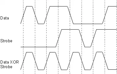 Existe una forma equivalente de especificar la relación entre Data y Strobe. Para los bits de datos pares, Strobe es lo opuesto a Data. Para bits de datos impares, Strobe es lo mismo que Data. A partir de esta definición, es más evidente que un XOR entre Data y Strobe producirá una señal de reloj. Además, esta es una de las formas más simples de generar la señal Strobe para un flujo de datos determinado.