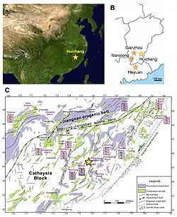 - ↑ a b c d e f Xing, Lida; Niu, Kecheng; Mallon, Jordan; Miyashita, Tetsuto (2023). «A new armored dinosaur with double cheek horns from the early Late Cretaceous of southeastern China». Vertebrate Anatomy Morphology Palaeontology (en inglés) 11. ISSN 2292-1389. doi:10.18435/vamp29396.