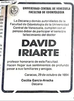 - ↑ a b c d e f g h Briceño-Iragorry., Leopoldo (2021). «Dr. David Roberto Iriarte Díaz (1903 - 1994)». Historia de la Otorrinolaringología en Venezuela. Ediciones de la Biblioteca EBUC-UCV, Universidad Central de Venezuela. pp. 175-178. ISBN 978-980-6708-41-9. Consultado el 17 de febrero de 2025.