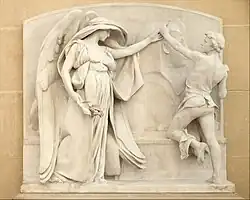 El monumento de French, encargado en 1889 y dedicado en 1893, muestra al Ángel de la Muerte tomando suavemente la mano de un escultor o tallador de piedra que está trabajando en una figura de esfinge muy parecida a la que crearon los hermanos.[3]