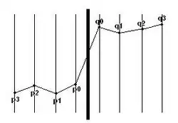 - Sample-Level Adaptivity of the Filter: En el Deblocking filter es muy importante que el algoritmo sea capaz de distinguir entre los bordes reales que pueda tener una imagen y los bordes creados debido a la cuantificación de los coeficientes de la DCT. Por tanto, el proceso de filtrado ha de ser capaz de no filtrar los bloques reales para preservar la imagen original y filtrar los bloques artificiales para reducir su visibilidad. En la figura 2, vemos un ejemplo de las muestras de dos bloques 4x4 vecinos con la frontera entre ellos. Si Bs=0 no se filtra. Si Bs>0 entonces se mide la diferencia entre muestras de chroma y luminancia a partir de estas condiciones: