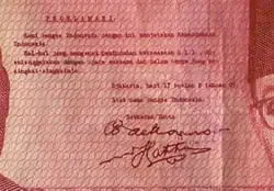 La declaración está escrita en la parte de atrás del billete de 100.000 rupias de la serie del año 2004.