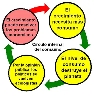 El decrecimiento, también conocido como decrecentismo, es un término utilizado tanto para un movimiento político, económico y social como para un conjunto de teorías que critican el paradigma del crecimiento económico.[1] Se basa en ideas de una amplia gama de líneas de pensamiento como la ecología política, la economía ecológica y la justicia ambiental, señalando el daño social y ecológico causado por la búsqueda del crecimiento infinito y los imperativos occidentales de "desarrollo".[2] El decrecimiento enfatiza la necesidad de reducir el consumo y la producción global (metabolismo social) y aboga por una sociedad socialmente justa y ecológicamente sostenible en la que el bienestar social y ambiental reemplace al PIB como indicador de prosperidad. Es probable que el PIB se redujese en una sociedad en la que se lograsen los objetivos del decrecimiento, aunque su incremento no es el objetivo principal del decrecimiento.[3]