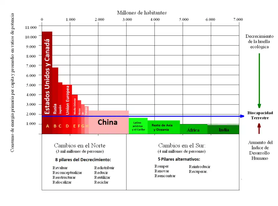 Así, globalmente se suele estimar en entre tres y ocho planetas los recursos necesarios para que la población mundial se acerque al nivel de vida actual europeo. Por lo tanto, la única forma de alcanzar la igualdad económica mundial de forma durable sería que los países ricos decrecieran.